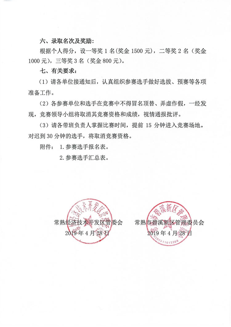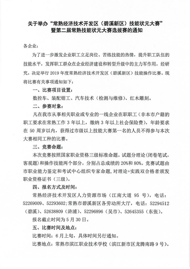 關(guān)于舉辦常熟經(jīng)濟(jì)技術(shù)開發(fā)區(qū)(碧溪新區(qū))技能狀元大賽暨第二屆常熟技能狀元大賽選拔賽的通知